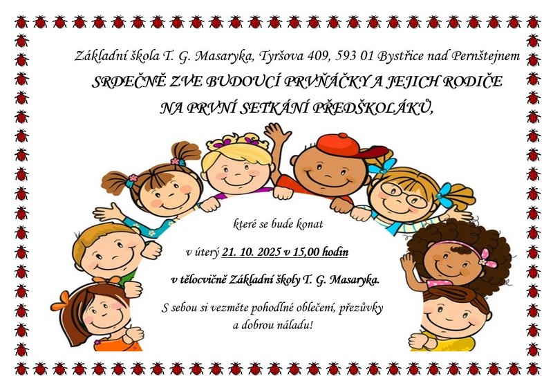 Milí budoucí prvňáčci, zveme Vás a Vaše rodiče na první setkání v naší škole ...