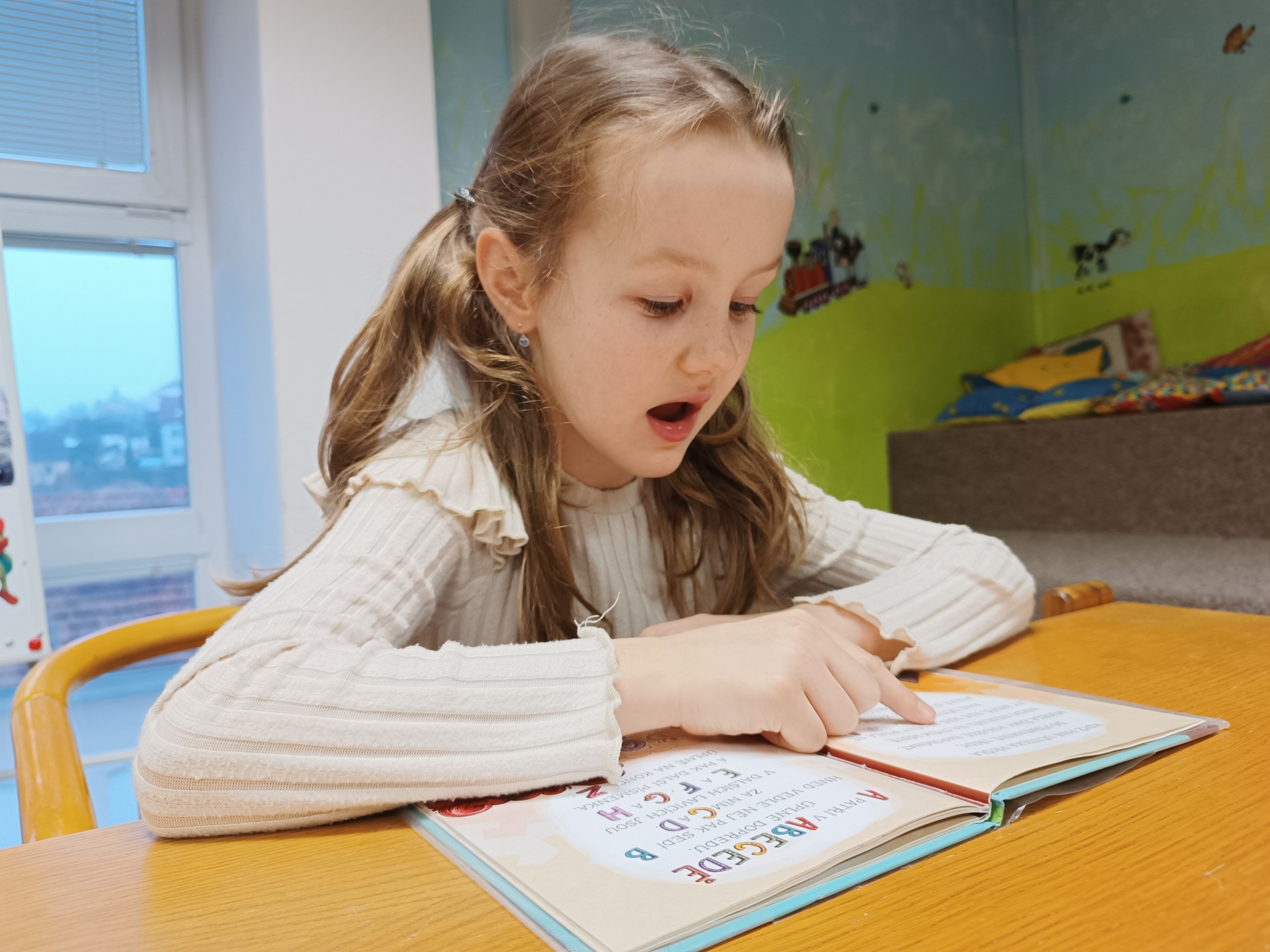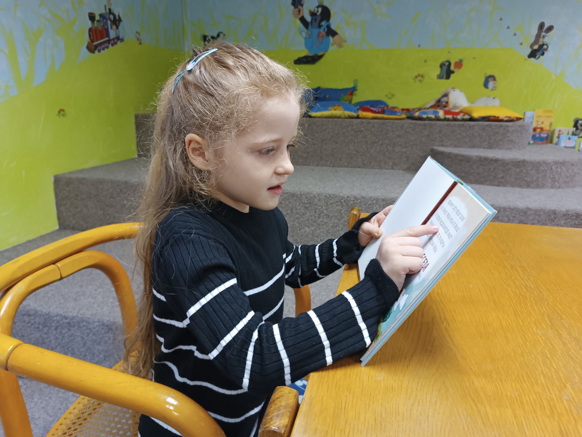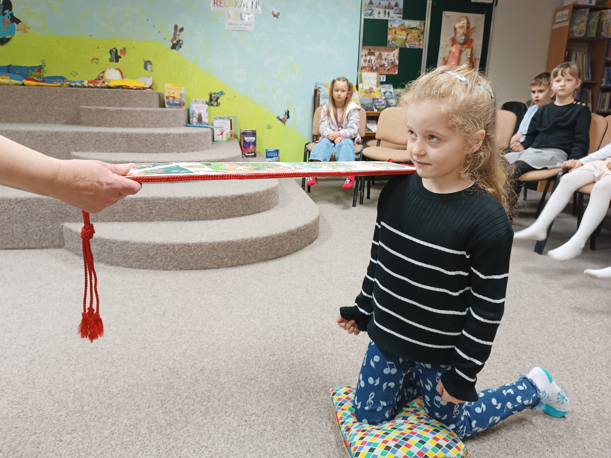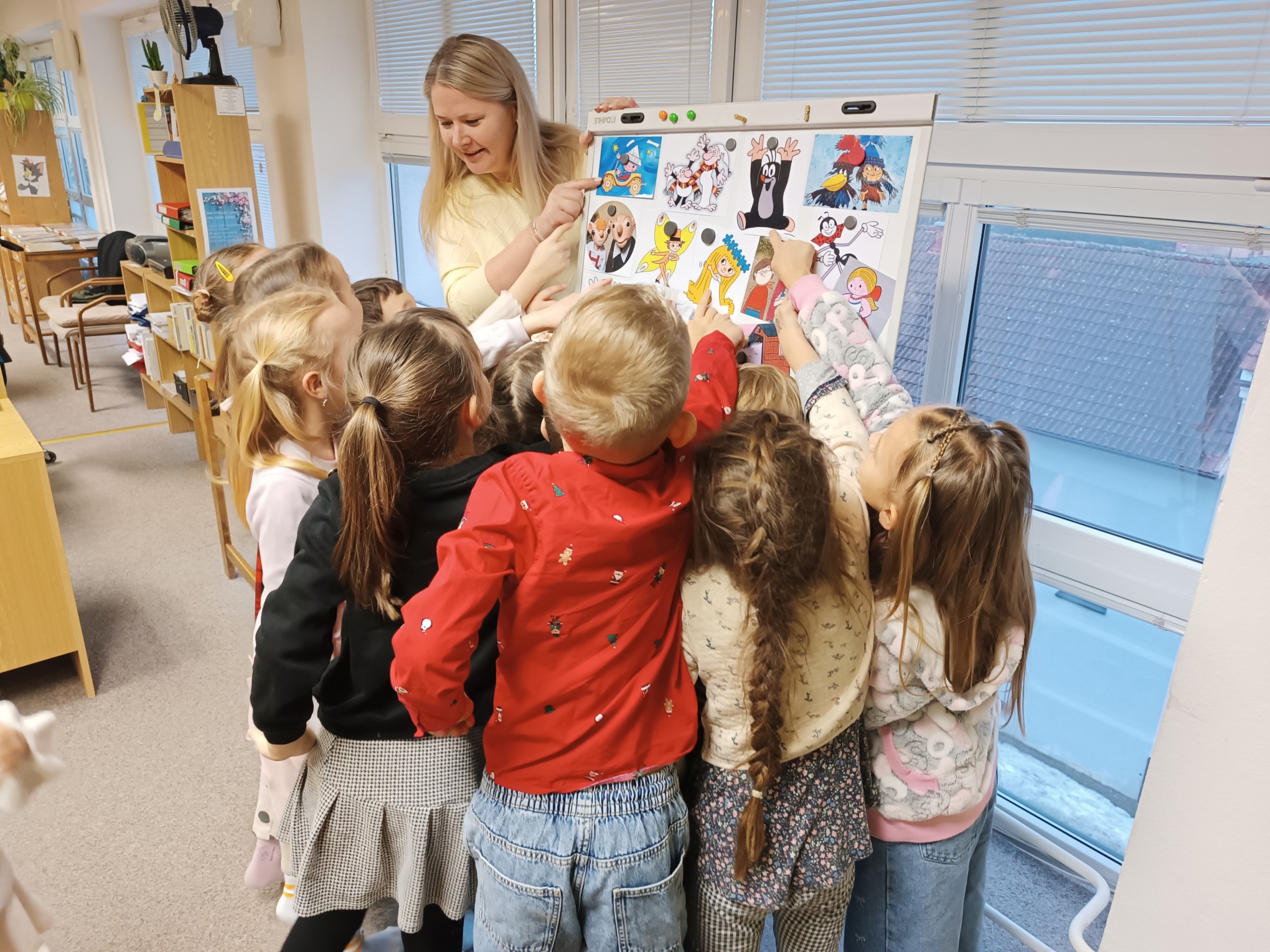 Nejprve ovšem museli splnit tři úkoly. V prvním úkolu si vybrali písmeno z abecedy a vymýšleli slovo, začínající na toto písmeno (zvíře, věc, …). Ve druhém úkolu poznávali podle obrázků pohádkové postavy z Večerníčků. Ve třetím úkolu některé děti předvedly na úryvku z knížky, jak už umí číst.