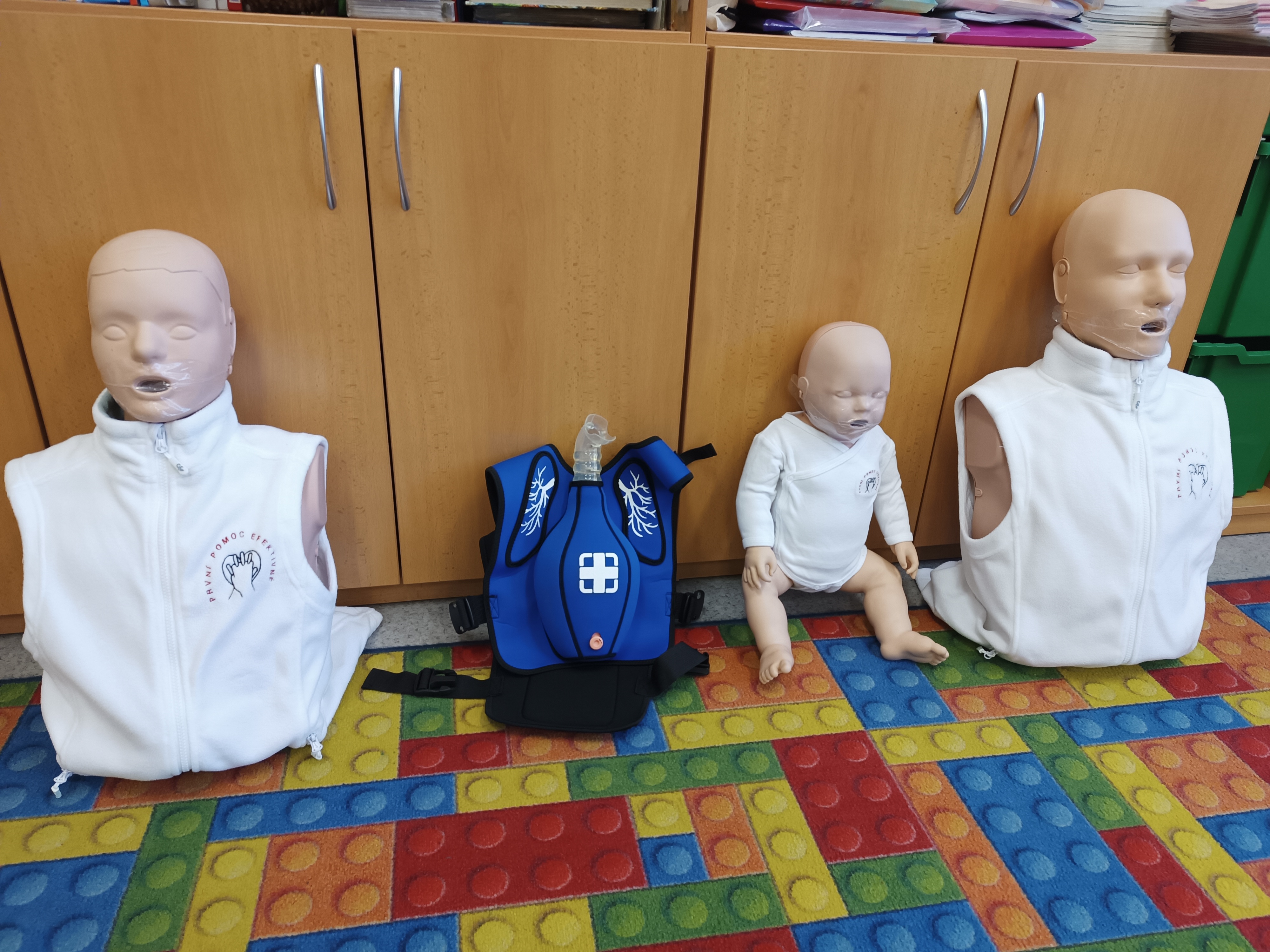 V poslední části jsme se věnovali uvolnění dýchacích cest při spolknutí nějakého předmětu (pomohla nám k tomu skvělá pomůcka - vesta) a také uvolnění dýchacích cest při zástavě dechu a bezvědomí. Prakticky jsme zkusili nepřímou masáž srdce - a že to není vůbec jednoduché ( i vzhledem k váze některých našich žáků).